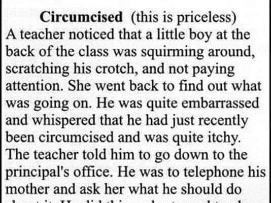 A teacher noticed that a little boy at the back of the class was squirming around, scratching his crotch, and not paying attention. She went back to find out what was going on. He was quite embarrassed and whispered that he had just recently been circumcised and was quite itchy. The teacher told him to go down to the principal’s office.