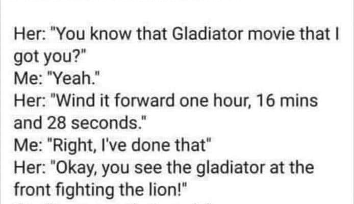 My daughter just phoned me and the conversation went like this!.. Her: “You know that Gladiator movie that I got you?” Me: “Yeah. “Her: “Wind it forward one hour, 16 minutes, and 28 seconds. “Me: “Right, I’ve done that”, Her: “Okay, you see the gladiator at the front fighting the lion! “Me: “I can see that, yeah.”