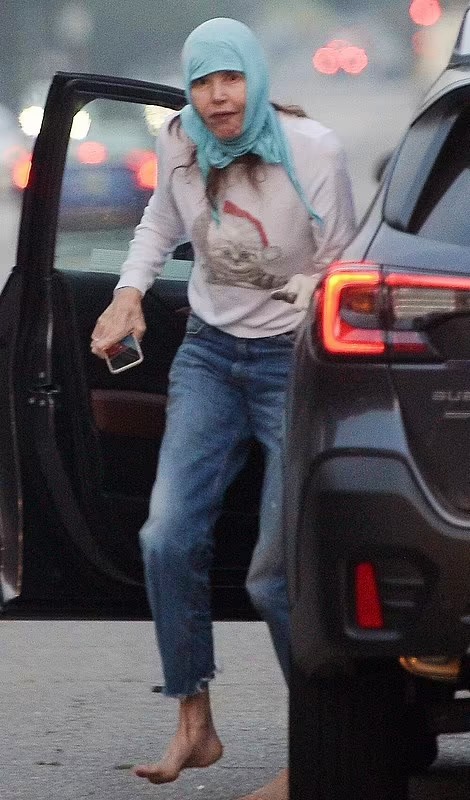 The 65-year-old actress went about her day barefoot while sporting a blue headscarf and a light-colored pullover with a cat motif.