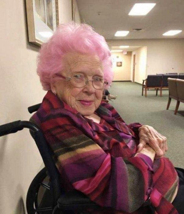 The photo was taken by a young woman who was speechless when, in the hallways of a hospital, she saw an old woman with pink hair, full of life, despite her advanced age.